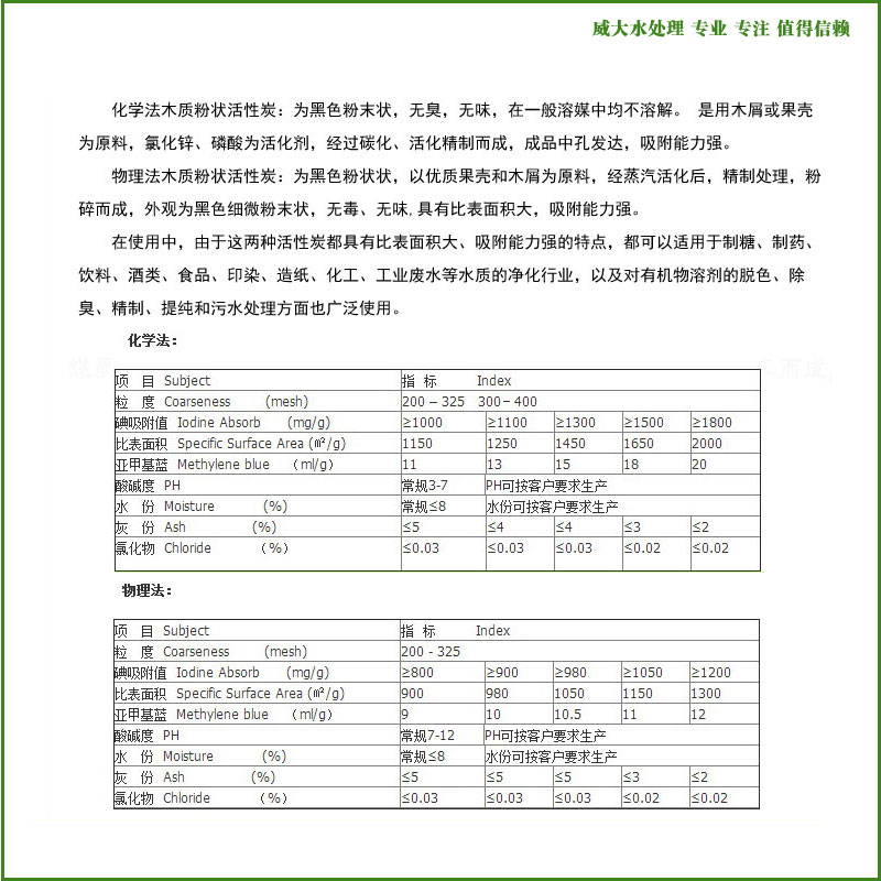 踏踏實(shí)實(shí),弘揚(yáng)匠人精神!兢兢業(yè)業(yè),塑造民族品牌!感謝您關(guān)注威大水處理官網(wǎng)木質(zhì)粉狀活性炭產(chǎn)品信息,也歡迎您提出寶貴的意見(jiàn),共同推進(jìn)中國(guó)制造的國(guó)際競(jìng)爭(zhēng)力!對(duì)威大木質(zhì)粉狀活性炭若有疑問(wèn)的地方,請(qǐng)撥打威大技術(shù)工程師電話: